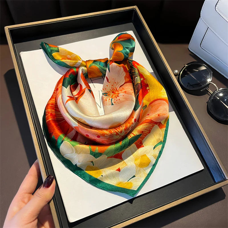 Inspiré des jardins parfumés de la côte amalfitaine, ce foulard déploie une symphonie de couleurs vives : vert éclatant, jaune solaire et orange chaleureux. Sur un fond blanc lumineux, les fleurs semblent éclore au gré de la lumière, offrant une touche de fraîcheur et de vitalité.